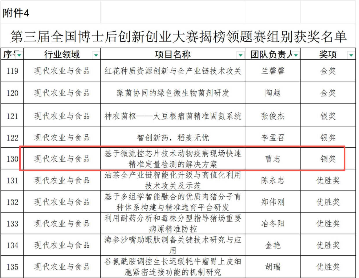 10月28日,以“博创引领四十载 智汇赋能向未来”为主题的第三届全国博士后创新创业大赛总决赛在福建省泉州市落下帷幕。在激烈竞争中,suncity太阳新城曹志副教授牵头的“基于微流控芯片技术动物疫病现场快速精准定量检测的解决方案”项目,凭借突出的创新能力和广阔的应用前景脱颖而出,荣获铜奖。作为我国博士后制度实施以来规模最大、覆盖最广的全国性赛事,本届大赛覆盖了现代农业与食品、新一代信息技术等七大战略新兴领域,吸引了8006个高水平项目参与角逐。此次获奖充分展现了学院在动物医学前沿交叉领域的科研实力与人才培养的卓越成效。