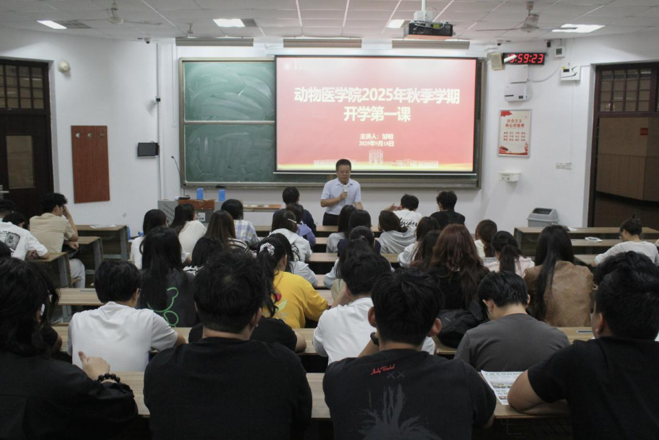 邹明教授首先从九一八这一特殊时间节点切入,引导学子思考当代青年的历史责任与时代担当,特别强调了动药学子肩负的历史使命与时代责任。他通过回顾中国人民抗日战争的艰难历程和伟大胜利,勉励学生要铭记历史、珍视和平,树立远大理想,勇担强农兴农使命。他指出,“青春因使命而厚重,人生因担当而升华”,动药学子要以“强国有我”的信念,在守护动物健康、保障食品安全的征程中书写无愧时代的青春答卷。