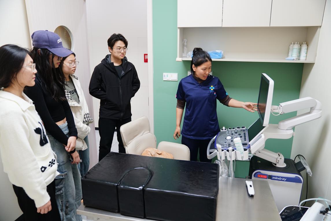 在医生带领下,同学们参观了医院诊室、药房及住院区域,近距离接触血检仪、宠物用CT设备等先进医疗设备,了解其应用场景,从而直观感受现代宠物医疗技术,并深入思考中西兽医结合发展趋势。