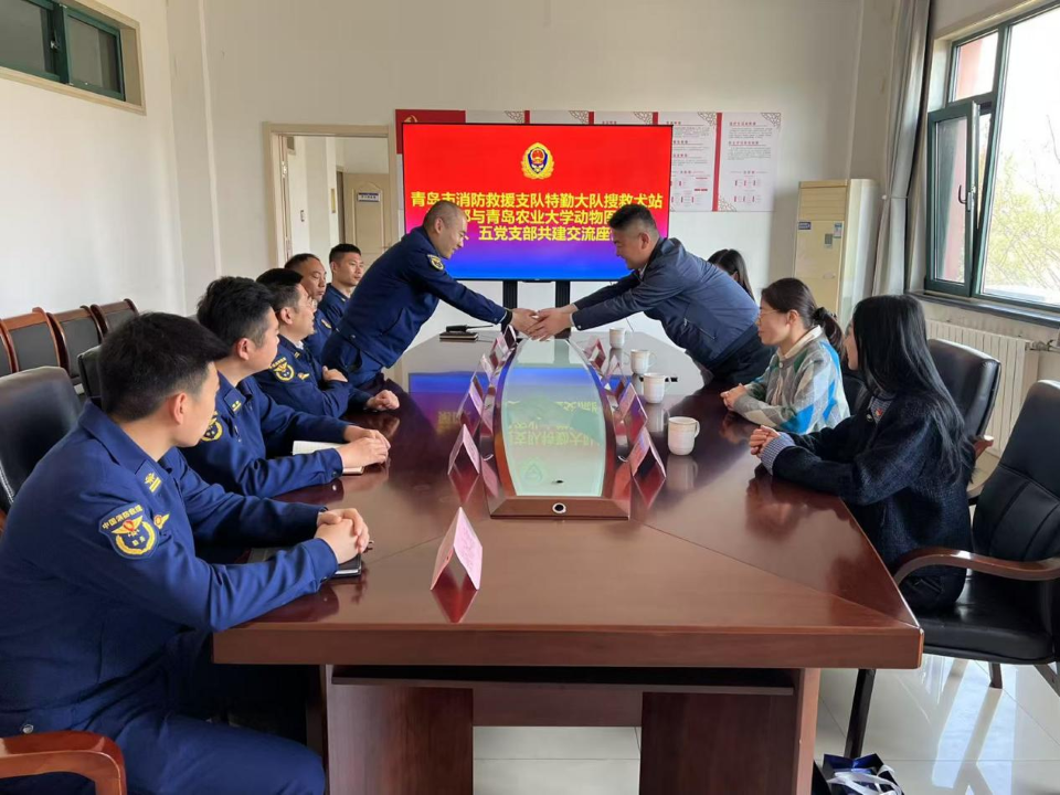 党支部代表们围绕共建背景与目标展开深入座谈。suncity太阳新城党委副书记、副院长王传兴介绍了学院在兽医领域的学科优势及党支部建设情况,强调此次共建是发挥学院动物医学专业特色、服务社会公共安全的务实举措,希望通过技术互助为搜救犬医疗保障赋能,在犬只健康管理、疫病预防、运动损伤诊疗等具体领域深化合作。青岛市消防救援支队特勤大队搜救犬站指导员姜华分享了搜救犬站在应急救援中的核心任务与党建工作特色,期待以党建共建推动双方的深度合作。